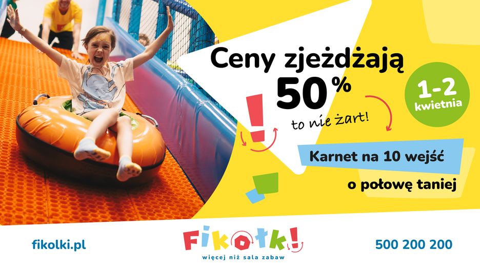 Mimo że to czas żartów, to rabat w wysokości 50% na karnet jest jak najbardziej prawdziwy. Pozwoli zaoszczędzić nawet ponad 200 zł. Karnet uprawnia do 10 całodniowych wejść. Może korzystać z niego rodzeństwo lub znajome dzieci. Promocja obowiązuje od piątku od godz. 17 (31 marca) do końca weekendu (2 kwietnia). Dzięki temu, że najbliższa niedziela jest handlowa, karnet w atrakcyjniejszej cenie można kupić w recepcji sali zabaw w galerii Posnania i w Starym Browarze przez niespełna trzy dni. Jeśli nie będziecie mieli okazji pojawić się osobiście, wówczas pozostaje zakup karnetu na stronie Fikołków.